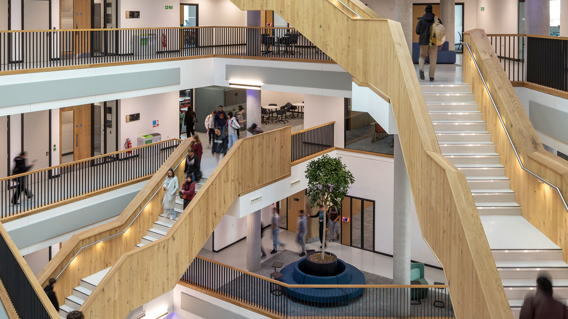 Key design features include a complex 36m geometric atrium with floating stairs and low carbon, prefabricated modular façade, which integrates with existing University buildings on Agard Street.